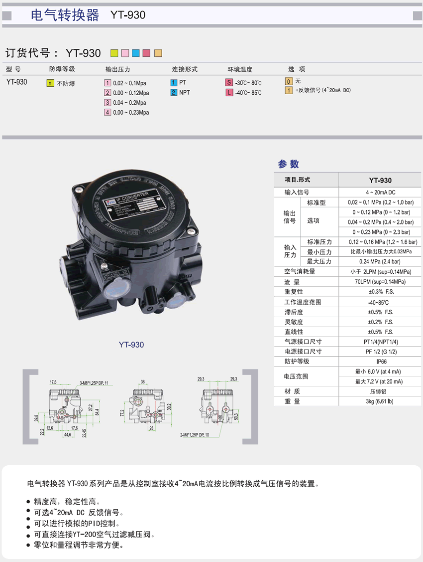 电气转换器YT-930 电气转换器YT-930系列产品是从控制室接收4-20mA电流按比例转换成气压信号的装置